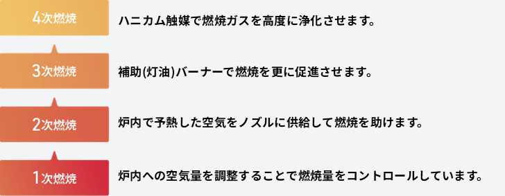 重油でも、ペレットでも、原木木材でも、燃料を燃焼させると必ず排ガスが発生します。エコボイラでは、4段階の燃焼プロセスを経て環境負荷の少ないクリーンな排ガスを実現しています。特にバイオマス燃料において課題となる「ばいじん(煤塵)」の発生についても、エコボイラの実測値は大気汚染防止法に基づく法定基準値の10分の1以下という極めて低い数値を記録しています。