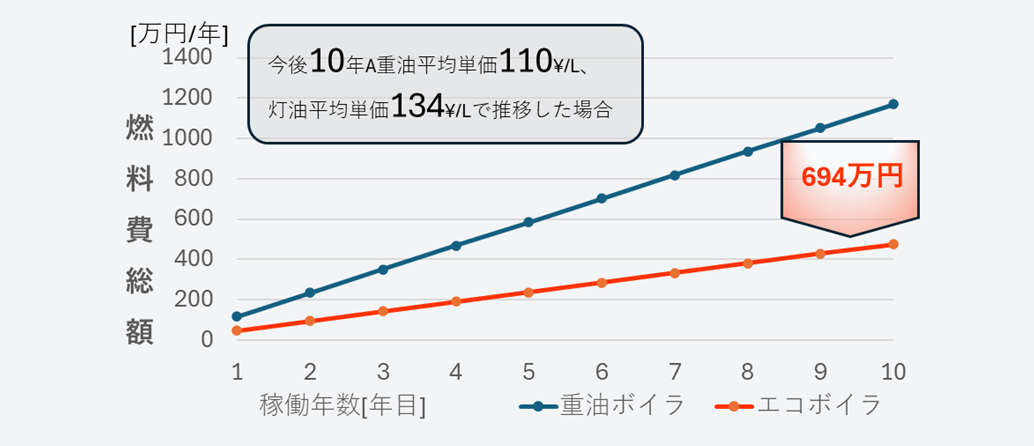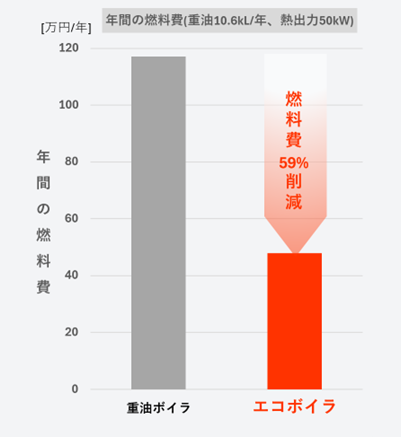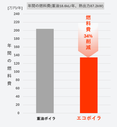 エコボイラHA100と同等の加温能力を持つ重油ボイラと比較した場合、燃料コストを削減することができます。