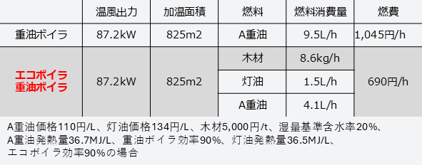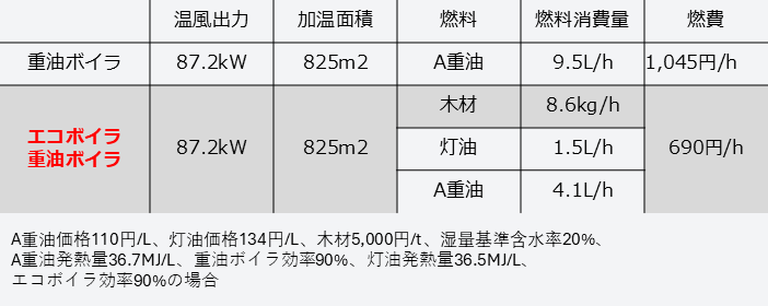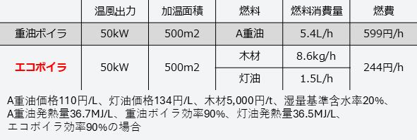 ※3 エコボイラ温風出力50kw、年間稼働日数122日(16時間/日x4カ月)木質燃料絶乾における高位発熱量18.3GJ/t、灯油単位発熱量36.5MJ/L、エコボイラ及び灯油温風機効率90%、リーケージ排出量(木質燃料運搬):0.1ton-CO2/年、CO2排出削減量:8.3ton-CO2/年、エコボイラ木質燃料(絶乾)使用量:12.5ton/年の場合とします。