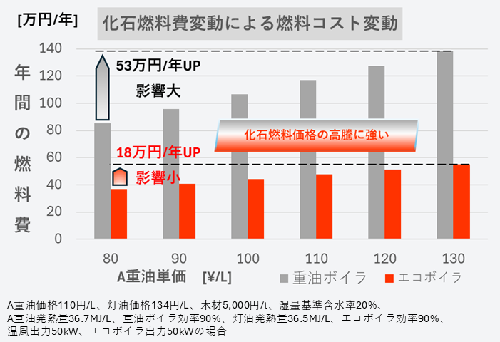 エコボイラは木質燃料を使用するため、化石燃料の価格が変動しても燃料コストの変動は小さくて済みます。
