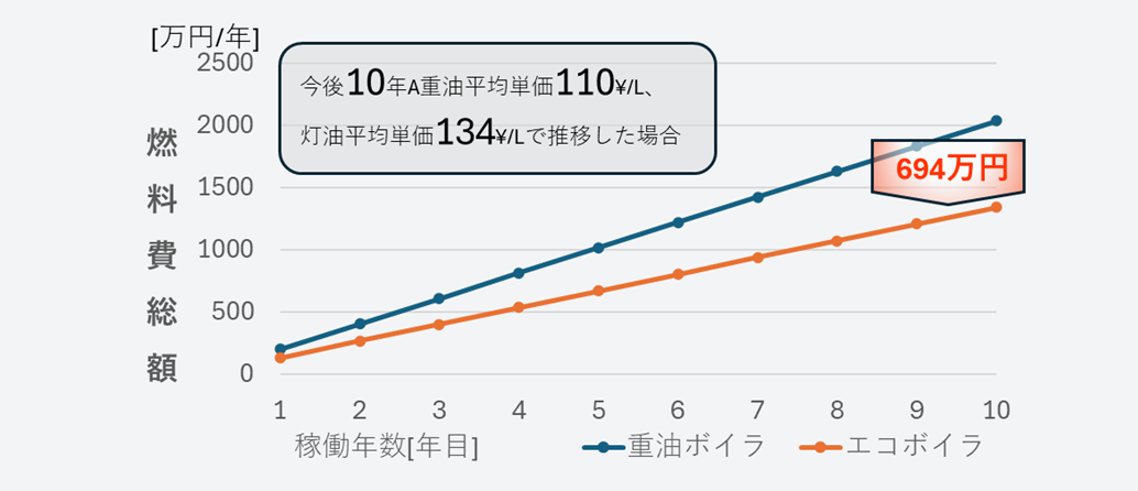 エコボイラHA100と同等の加温能力を持つ重油ボイラと比較した場合、燃料コストを削減することができます。
