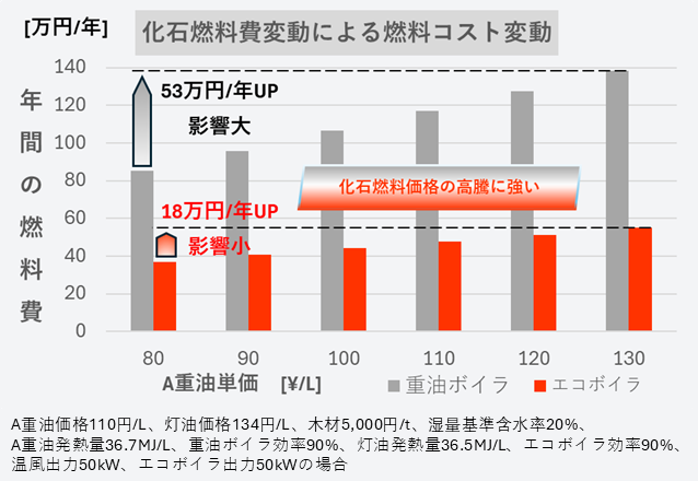 エコボイラは木質燃料を使用するため、化石燃料の価格が変動しても燃料コストの変動は小さくて済みます。