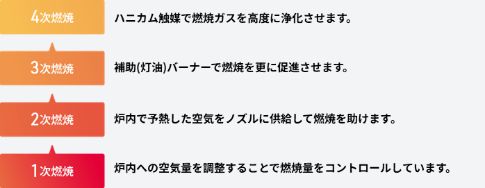 重油でも、ペレットでも、原木木材でも、燃料を燃焼させると必ず排ガスが発生します。エコボイラでは、4段階の燃焼プロセスを経て環境負荷の少ないクリーンな排ガスを実現しています。特にバイオマス燃料において課題となる「ばいじん(煤塵)」の発生についても、エコボイラの実測値は大気汚染防止法に基づく法定基準値の10分の1以下という極めて低い数値を記録しています。