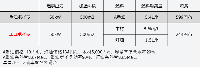 ※3 エコボイラ温風出力50kw、年間稼働日数122日(16時間/日x4カ月)木質燃料絶乾における高位発熱量18.3GJ/t、灯油単位発熱量36.5MJ/L、エコボイラ及び灯油温風機効率90%、リーケージ排出量(木質燃料運搬):0.1ton-CO2/年、CO2排出削減量:8.3ton-CO2/年、エコボイラ木質燃料(絶乾)使用量:12.5ton/年の場合とします。